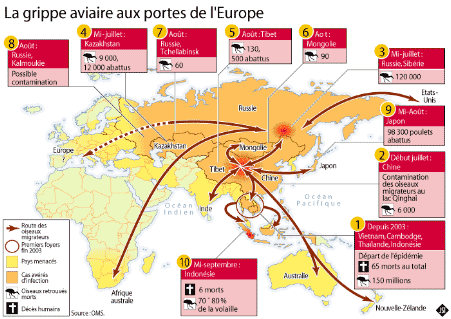 H5N1 s’est installé depuis 2 ans en Asie sans que les autorités des États concernés n’aient pu l’éradiquer. Aujourd’hui il semble être en mesure de se propager hors du continent, en direction de l’Europe, de l’Afrique et des États-Unis.